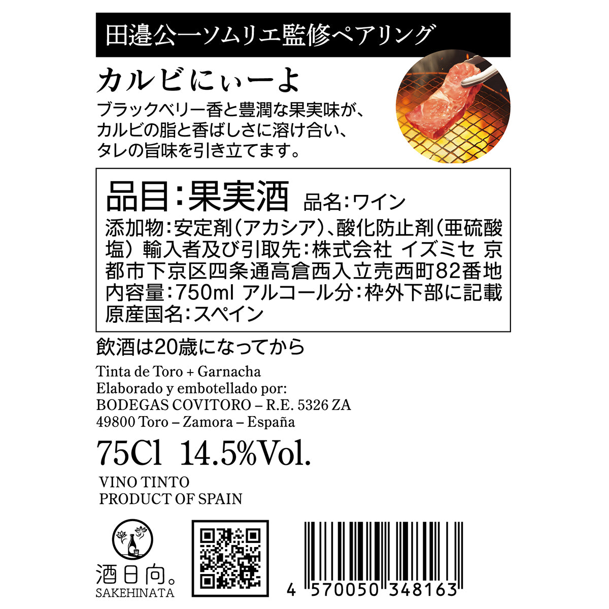 {"id":10082891956540,"title":"カルビにぃーよ【田邉公一ソムリエ監修ペアリング】","handle":"short-ribsnii-yo","description":"\u003cstyle\u003e\n.font-txt [color=\"#3D3D3D\"],\nspan[style=\"color: #3d3d3d;\"] {\n font-size: 15px;\n}\n\u003c\/style\u003e\n\n\u003cp\u003e\u003cimg width=\"100%\" src=\"https:\/\/image.rakuten.co.jp\/kyotopi\/cabinet\/bnr_pc.jpg\"\u003e\u003c\/p\u003e\n\u003cdiv class=\"img-left\"\u003e\n\u003cimg width=\"350\" src=\"https:\/\/image.rakuten.co.jp\/kyotopi\/cabinet\/rakuten65\/436692-01.jpg\"\u003e\n\u003cdiv class=\"font-txt\"\u003e\n\u003cspan style=\"color: #8b6239;\"\u003e カルビと赤ワインが互いに高め合う!\u003cbr\u003e究極焼肉ペアリング、ここに完成\u003c\/span\u003e\u003cbr\u003e\u003cbr\u003e\u003cspan style=\"color: #3d3d3d;\"\u003e 焼肉といえばカルビ。カルビといえば焼肉。\u003cbr\u003e肉の旨みと脂の甘みを同時に噛み締めることができるカルビはなんといっても焼肉の主役! \u003cbr\u003eそれに合わせるのはガツンとパワフルな赤ワインが正解なのにゃ。\u003cbr\u003e\u003cbr\u003e肉の旨みを爆増させる究極の焼肉ペアリング、これは試すしかないやつ!\u003c\/span\u003e\n\u003c\/div\u003e\n\u003c\/div\u003e\n\u003cp\u003e\u003cbr\u003e\u003c\/p\u003e\n\u003cdiv class=\"box3\"\u003e\n\u003cp\u003e飲み方\u003c\/p\u003e\n\u003c\/div\u003e\n\u003cdiv class=\"img-left\"\u003e\n\u003cimg width=\"350\" src=\"https:\/\/image.rakuten.co.jp\/kyotopi\/cabinet\/rakuten65\/436692-02.jpg\"\u003e\n\u003cdiv class=\"font-txt\"\u003e\n\u003cspan style=\"color: #8b6239;\"\u003e 人気の田邉公一ソムリエ監修\u003cbr\u003eプロのペアリングをご賞味あれ\u003c\/span\u003e\u003cbr\u003e\u003cbr\u003e\u003cspan style=\"color: #3d3d3d;\"\u003e このカルビと赤ワインのペアリングを監修してくれたのが、SNSでの情報発信が大人気の田邉公一ソムリエ。\u003cbr\u003eカルビの旨み・脂の甘み、さらにはタレの持つ風味までを計算し、濃厚な赤ワインの果実味でまとめあげる。\u003cbr\u003eプロ監修ならではの料理とワインのマリアージュ、ぜひお楽しみくださいにゃ!\u003c\/span\u003e\n\u003c\/div\u003e\n\u003c\/div\u003e\n\u003cbr\u003e\n\u003cdiv class=\"box3\"\u003e\n\u003cp\u003eポイント\u003c\/p\u003e\n\u003c\/div\u003e\n\u003cdiv class=\"img-left\"\u003e\n\u003cimg width=\"350\" src=\"https:\/\/image.rakuten.co.jp\/kyotopi\/cabinet\/rakuten65\/436692_1200_2.jpg\"\u003e\n\u003cdiv class=\"font-txt\"\u003e\n\u003cspan style=\"color: #8b6239;\"\u003e ティンタ・デ・トロにガルナッチャをブレンド\u003cbr\u003e濃い〜果実味は肉料理全般に\u003c\/span\u003e\u003cbr\u003e\u003cbr\u003e\u003cspan style=\"color: #3d3d3d;\"\u003e 使っている品種はスペインを代表するワインの一種であるティンタ・デ・トロとガルナッチャ。\u003cbr\u003e豊かなブラックベリーの香りに豊潤な果実味が、カルビの脂と香ばしさに溶け合って、タレの旨みを引き立ててくれるのにゃ! \u003cbr\u003e\u003cbr\u003e冷やしすぎずに大きめグラスで召し上がれ♪\u003c\/span\u003e\n\u003c\/div\u003e\n\u003c\/div\u003e\n\u003cp\u003e\u003cbr\u003e#カルビにぃーよ\u003cbr\u003e\u003cbr\u003e\u003c\/p\u003e\nジュワッと香ばしくて噛めば中から肉汁が溢れてくる……カルビはやっぱり焼肉の“華”ですよね。そんなカルビの旨みを極限まで引き出すには、やっぱりパワフルな赤ワインが必要!人気の田邉公一ソムリエが選んだこのワインを合わせると、肉の旨みにワインの複雑味が加わって、無限に食べられるおいしさ!\u003cbr\u003e\u003cbr\u003e\n【田邉ソムリエコメント】\u003cbr\u003e\nワインから感じるブラックベリーとブラックチェリーの豊かな果実香、スパイスやローストのニュアンス、熟した果実の豊潤な味わいと緻密でややしっかりとしたタンニンが、カルビの風味と脂質と溶け合い、タレの風味と香ばしいフレーヴァーに相乗し、双方の味わいの深みが増します。\n\u003cbr\u003e\u003cbr\u003e\n\n\u003ctable width=\"400\" cellspacing=\"0\" cellpadding=\"0\" border=\"0\" id=\"ItemTB\"\u003e\n\u003ctr\u003e\n\u003cth\u003eカテゴリー\u003c\/th\u003e\n\u003ctd\u003e赤ワイン\u003c\/td\u003e\n\u003c\/tr\u003e\n\u003ctr\u003e\n\u003cth\u003e甘辛度合\u003c\/th\u003e\n\u003ctd\u003e芳醇辛口\u003c\/td\u003e\n\u003c\/tr\u003e\n\u003ctr\u003e\n\u003cth\u003eぶどうの品種\u003c\/th\u003e\n\u003ctd\u003eティンタ・デ・トロ70%、ガルナッチャ30%\u003c\/td\u003e\n\u003c\/tr\u003e\n\u003ctr\u003e\n\u003cth\u003eアルコール度数\u003c\/th\u003e\n\u003ctd\u003e14.5度\u003c\/td\u003e\n\u003c\/tr\u003e\n\u003ctr\u003e\n\u003cth\u003e原産国\u003c\/th\u003e\n\u003ctd\u003eスペイン\u003c\/td\u003e\n\u003c\/tr\u003e\n\u003ctr\u003e\n\u003cth\u003e産地\u003c\/th\u003e\n\u003ctd\u003eサモーラ県トロ\u003c\/td\u003e\n\u003c\/tr\u003e\n\u003ctr\u003e\n\u003cth\u003e保管方法\u003c\/th\u003e\n\u003ctd\u003e高温、直射日光を避け、低温で保存してください。\u003c\/td\u003e\n\u003c\/tr\u003e\n\u003c\/table\u003e\n\u003cbr\u003e\n◎おススメの飲み方\u003cbr\u003e\nワインが持つブラックベリーの香りと芳醇な果実味を楽しむためにも冷やしすぎないのがポイント。濃厚な果実味としっかりとした渋みと酸味が、カルビの脂と溶け合い、タレの旨みを引き出します。できれば大きめのグラスに注いで楽しんで。\u003cbr\u003e\u003cbr\u003e\n\n※ラベルは1枚ずつ”手貼り ”のため、若干の歪みやヨレがある場合がございます。予めご了承