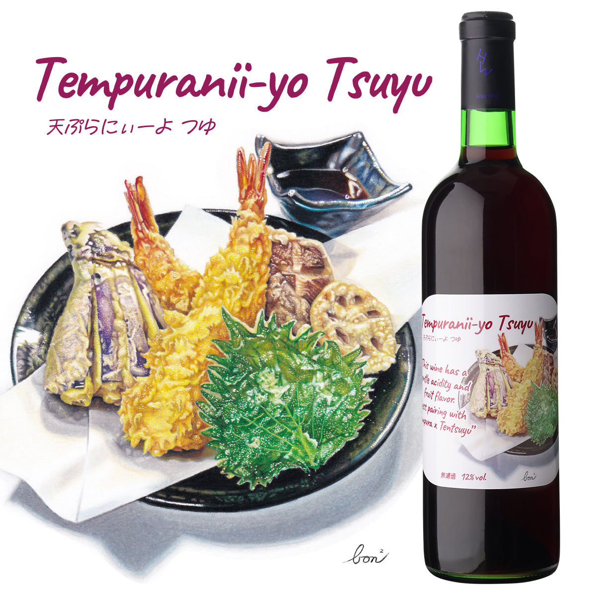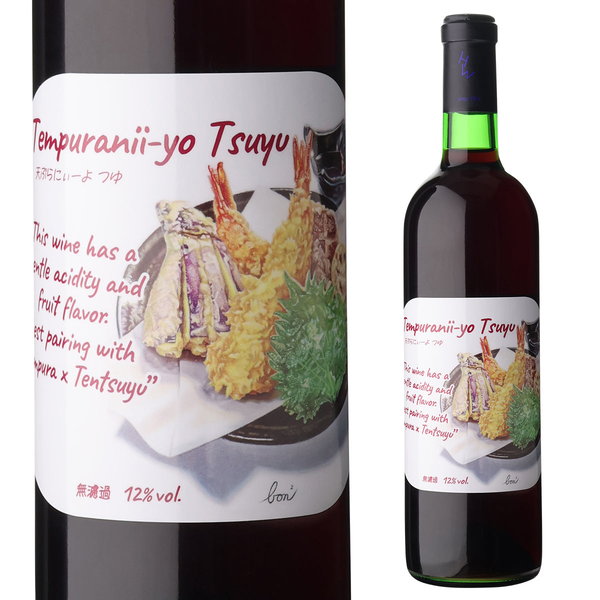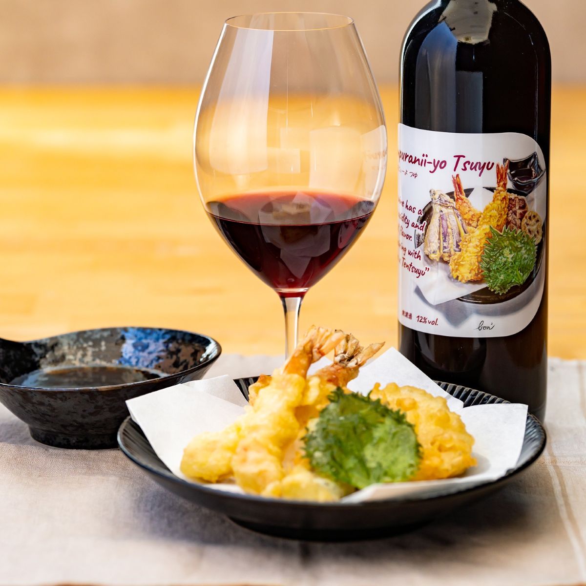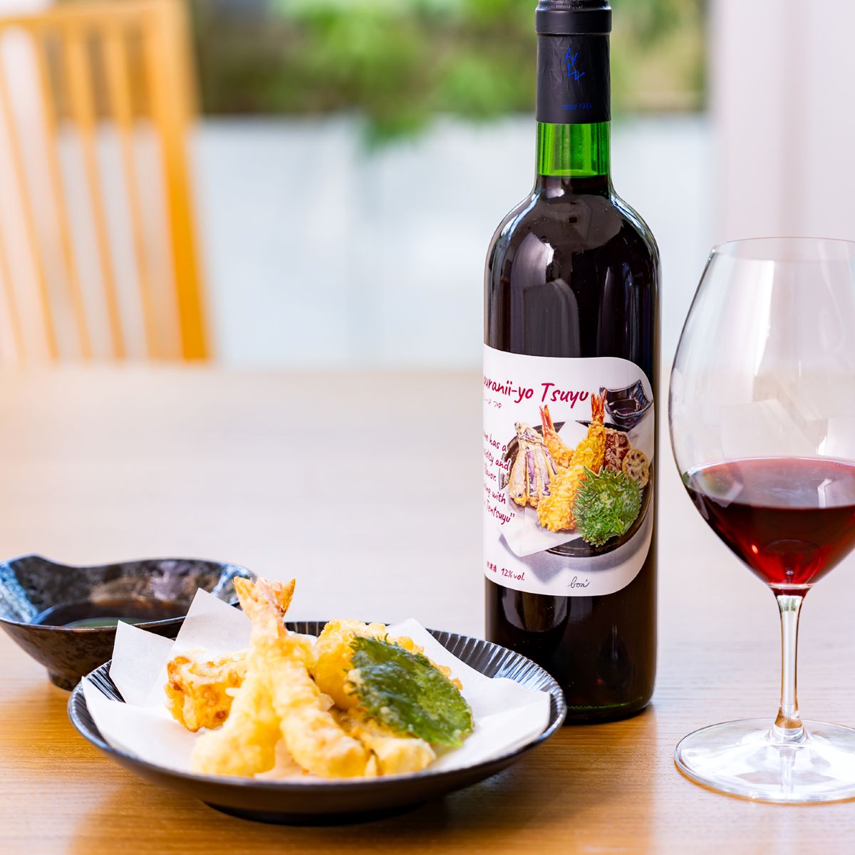 天つゆで食べる天ぷら用に造られたワイン! 『天ぷらにぃーよ つゆ!!』 マスカット・ベーリーAから造られた日本産の赤ワインは、食材の旨味を引き立てる出汁のような繊細な味わいで、日本食に寄り添う優しさが魅力です。特に、つゆでいただく天ぷらとは絶妙なペアリングをお楽しみいただけます。軽く冷やしてお召し上がりください。